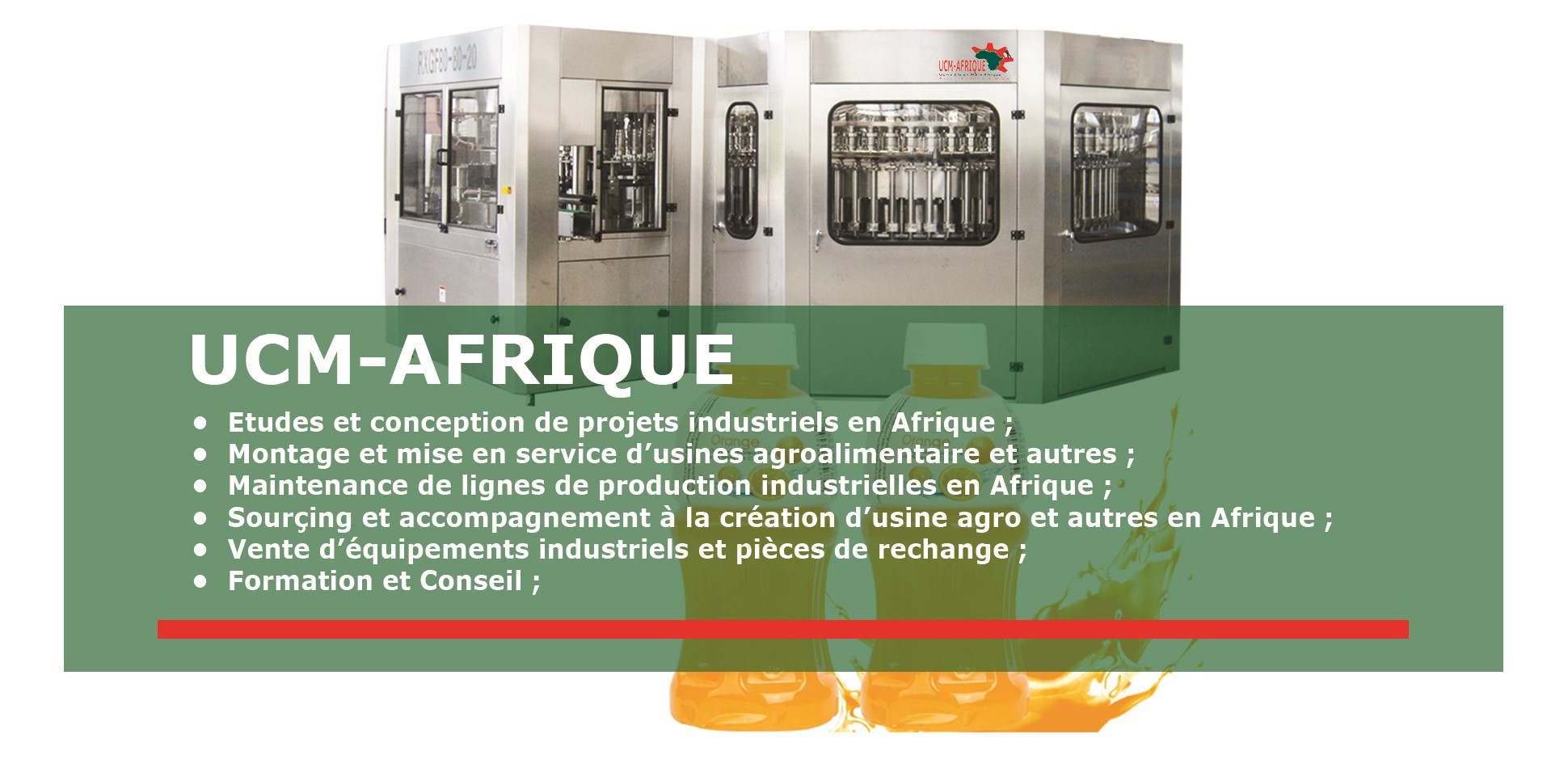 UCM Afrique peut accompagner les Etats africains, les industriels , desireux investir et entreprendre en Afrique dans le secteur industriel avec des solutions clés en main d’usines notamment en agroalimentaire, bâtiment et travaux publics, cosmétique, Education et bureatique, ...